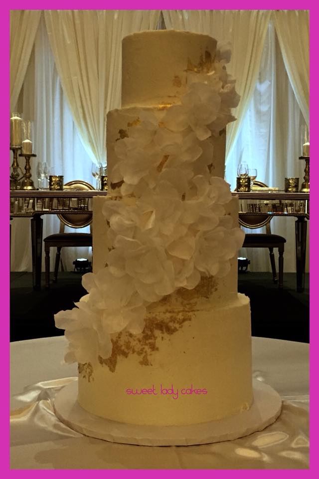 White on white with wafer paper flowers and gold leaf foliage. Elegant from the front with a little surprise at the back. The couple are avid soccer players.